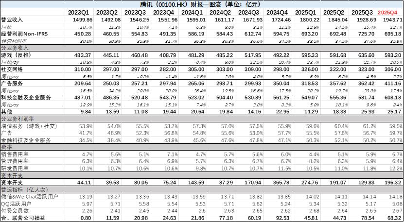 3月17日尾盘,腾讯发布了2025年四季度财报,营业收入录得1943.7亿元,同比增长12.7%,略高于市场一致性预期,净利润为582.6亿元,同比增长14%,经营利润率35.8%,与预期基本一致。(下图为腾讯一图流,数据均来自于财报,单位亿元,锦缎研究院整理)
