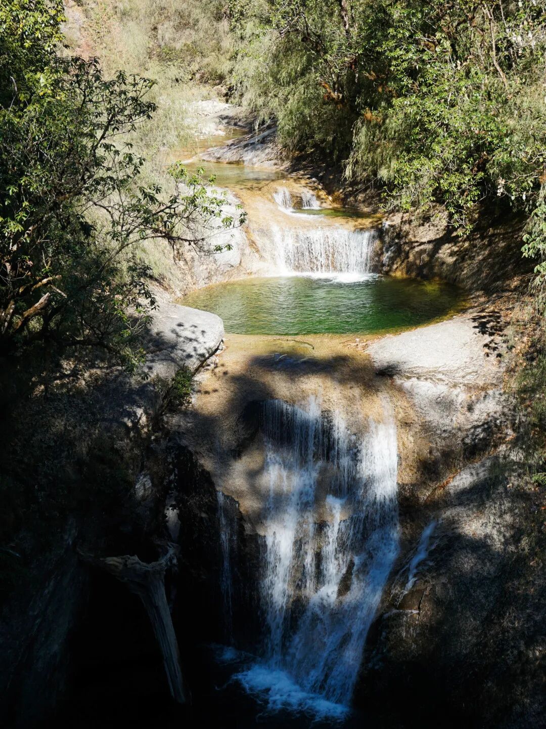 对于疲惫的徒步者来说,风景的意义,往往是抓住一个“继续走下去”的理由:每当爬上一段落差,就会亮起一颗新的宝石。这里并没有路可以走,于是我们手脚并用,从一块石头跳到另一块石头,就这么拾级而上。不一会儿就累得气喘吁吁。