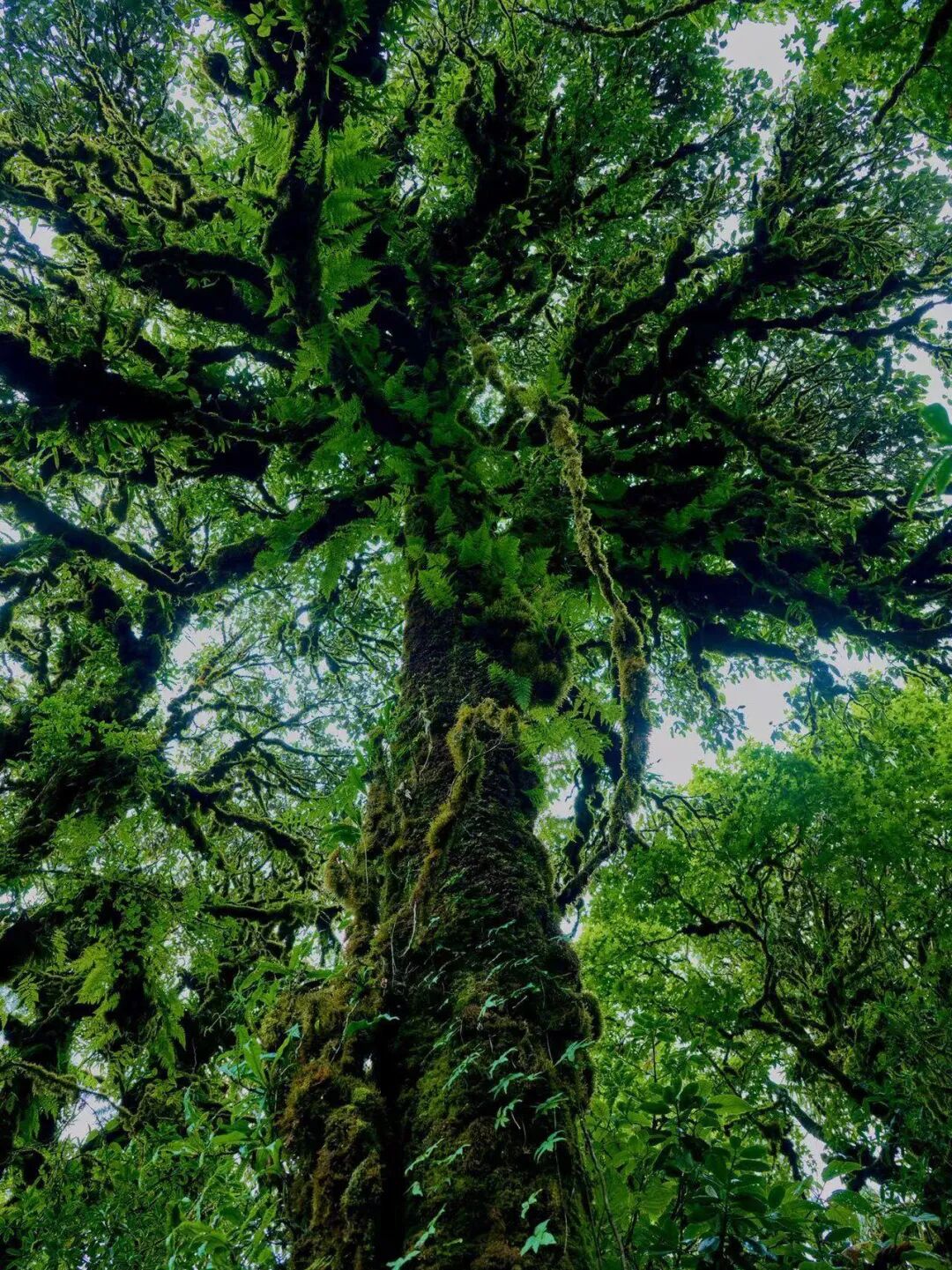 这里是山坡的背阴侧,气候陡然变得阴凉,湿润的水汽充盈四周。仰头望去,尽是密不透光的巨树枝叶;连绵的地衣与厚重的腐殖质,组成深绿色的海洋。一片广阔的“毛毛球森林”在眼前展开,犹如克苏鲁电影中潘神迷宫的入口。