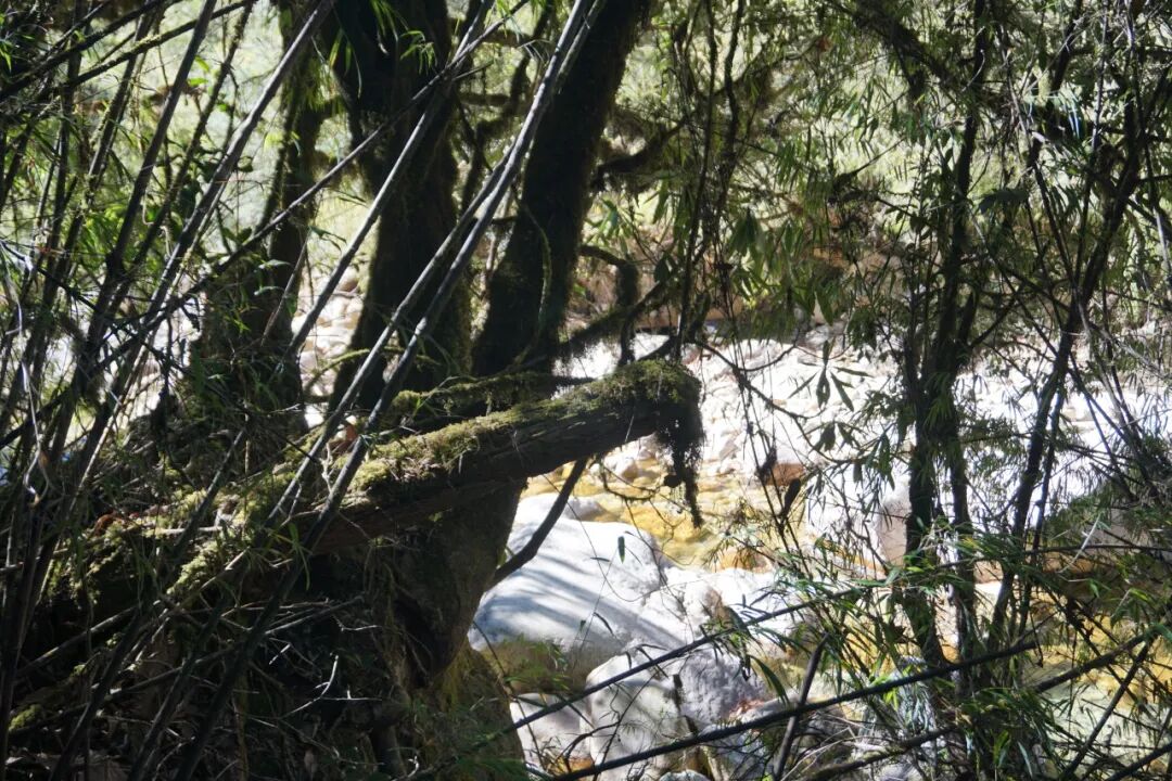 奇怪的是,注意力越窄,感官反而越灵,风从哪边来、石头稳不稳、是否有水声,不需要大脑去思考,身体自己就知道。此刻我们已经接近溪谷,两侧竹林茂密,脚下不时有细流经过。好在是冬天,土地里没有积水,并不至于陷进沼泽里。
