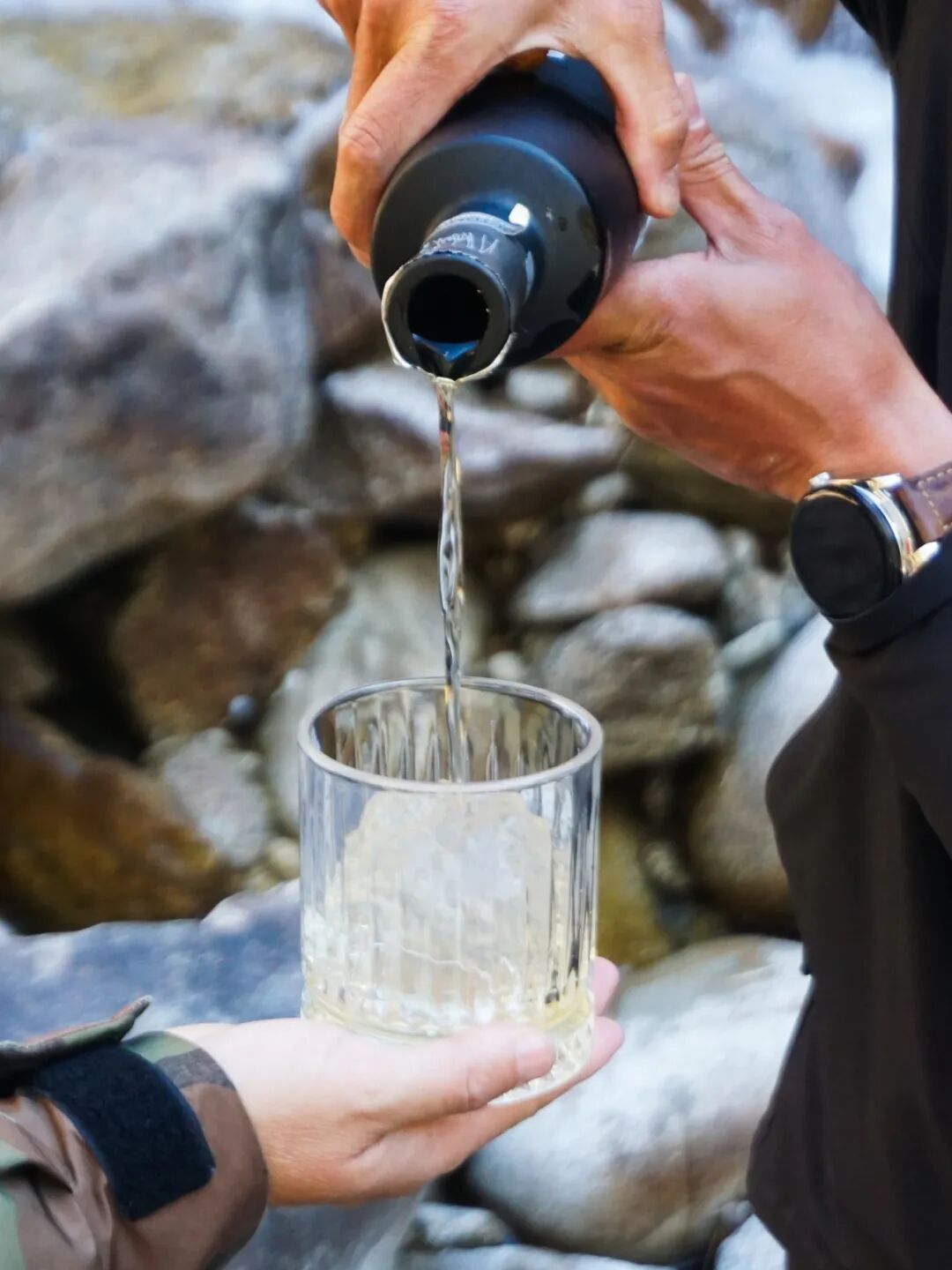 力道完美,他从瀑布里取到了一大块冰,在阳光下晶莹剔透,冒着丝丝寒气。接着,他熟稔地把冰切削成一块圆润的冰球,又从包里拿出了一瓶威士忌,一齐倒进了玻璃杯。“高黎贡山泉威士忌,干杯。”他满意地举起杯子。冰球微微摇晃,发出叮咚的声音。