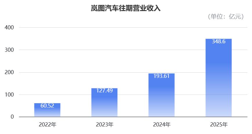 收入层面,岚图汽车的营业收入从2022年的60.5亿元,猛增至2023年的127.5亿元,并进一步在2024年达到193.6亿元。