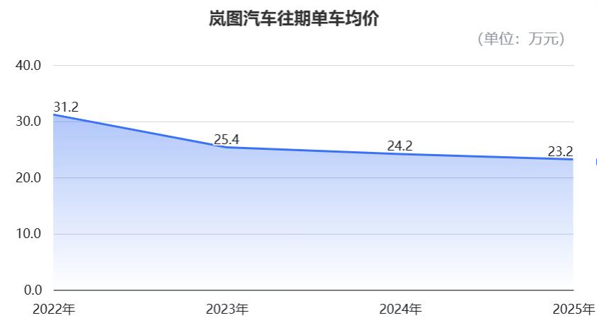 粗略计算,岚图汽车的单车均价,在2022年、2023年、2024年以及2025年分别为31.2万元、25.4万元、24.2万元和23.2万元。