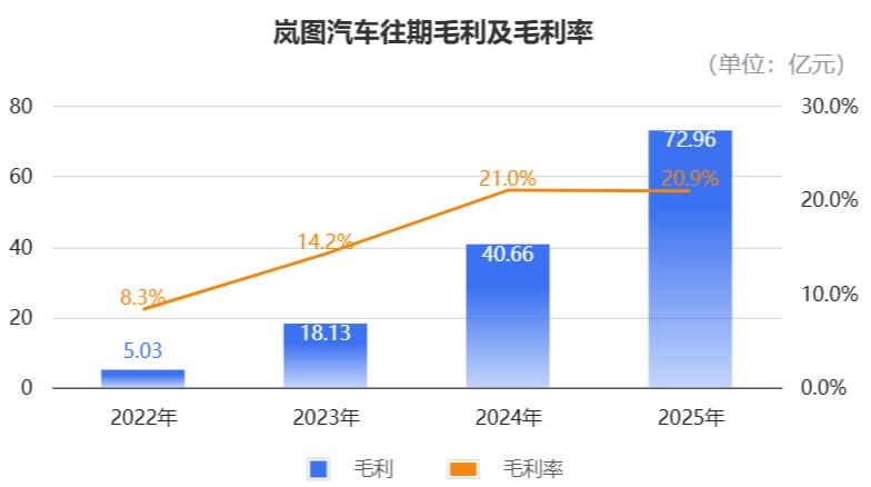 2022年到2025年,岚图的毛利分别为5.03亿元、18.13亿元、40.65亿元和72.96亿元。