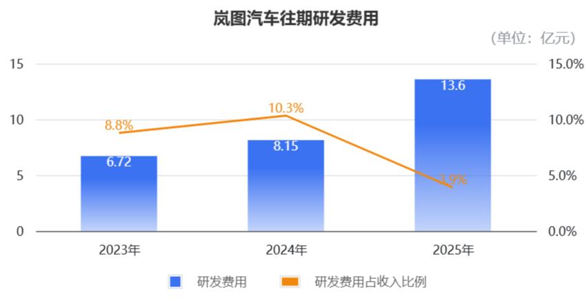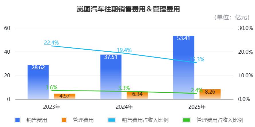 “三费”当中,2023年到2025年,岚图的研发费用分别为6.72亿元、8.15亿元、13.6亿元,占总收入的比重分别为5.3%、4.2%、3.9%,可以看到研发效率有提高走势。