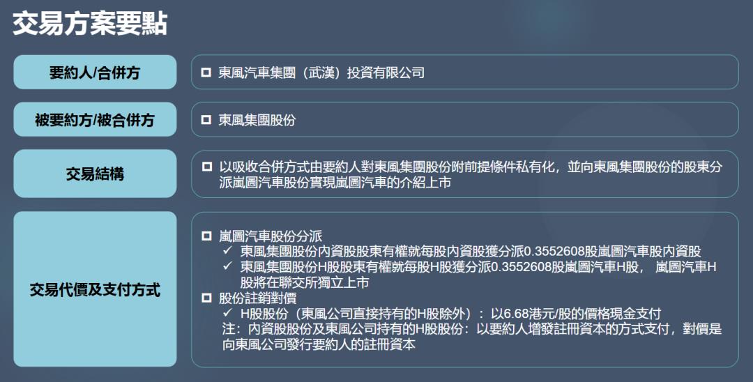 通俗来说,就是用股权、现金交换股东手中的所有股份,让东风集团股份从上市公司变成非上市公司,完成私有化。