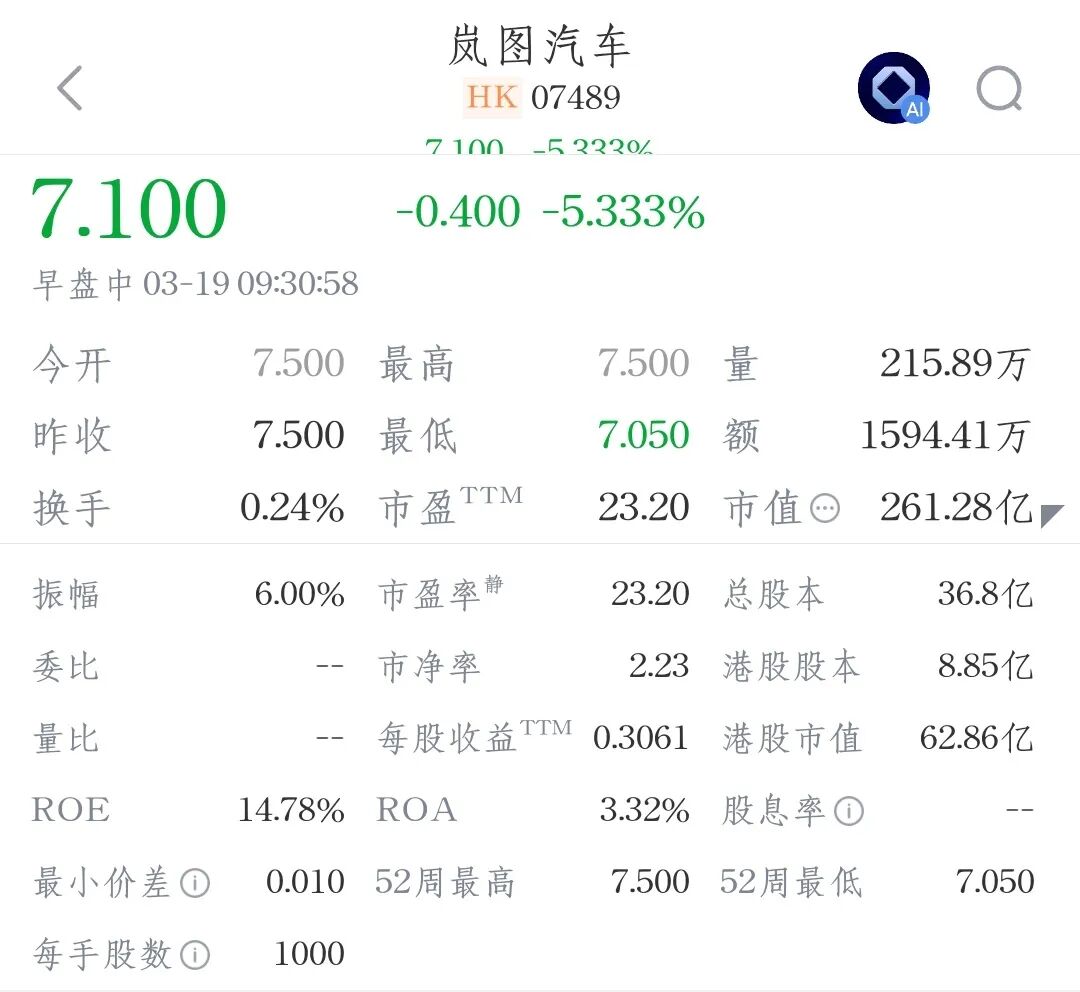 今日赴港上市,岚图汽车开盘价7.5港元/股,开盘市值259.4亿港元。