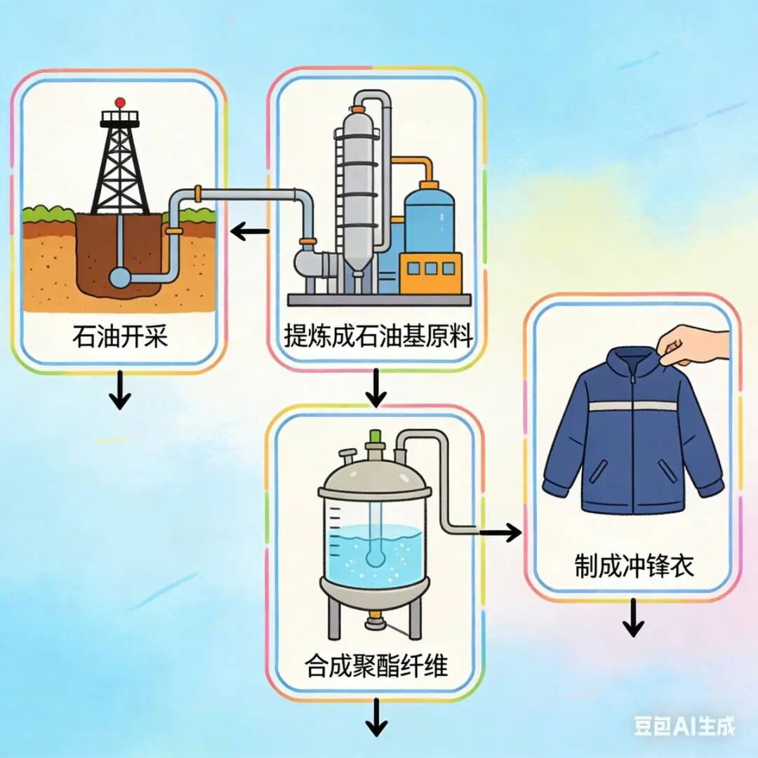简而言之,它是这么个加工的过程,石油 → 加热裂解 → 变成小分子化学原料 → 聚合拉丝 → 做成化纤面料(涤纶、锦纶、腈纶…)