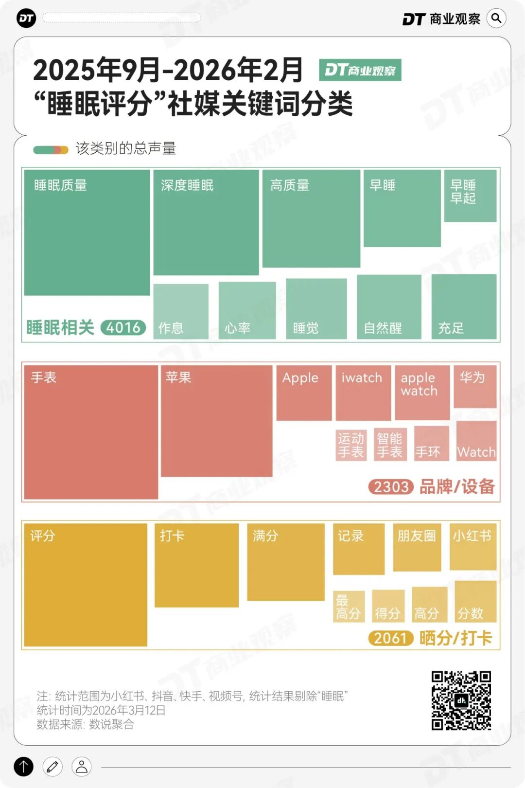 从社媒关键词来看,人们对“睡眠评分”的讨论,主要集中在睡眠本身、监测设备、晒分打卡行为三大维度,我们也由此得出三个发现。