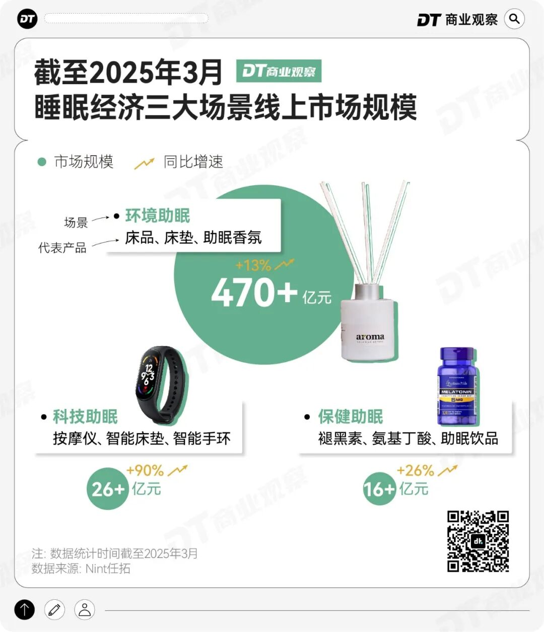 根据任拓数据,截至2025年3月,国内线上睡眠经济市场规模已超500亿,围绕不同的睡眠痛点,形成了三条路径——从改善睡眠环境和基础床品,到选购合适的保健品调节身体机能,再到用科技手段监测、甚至干预睡眠过程。