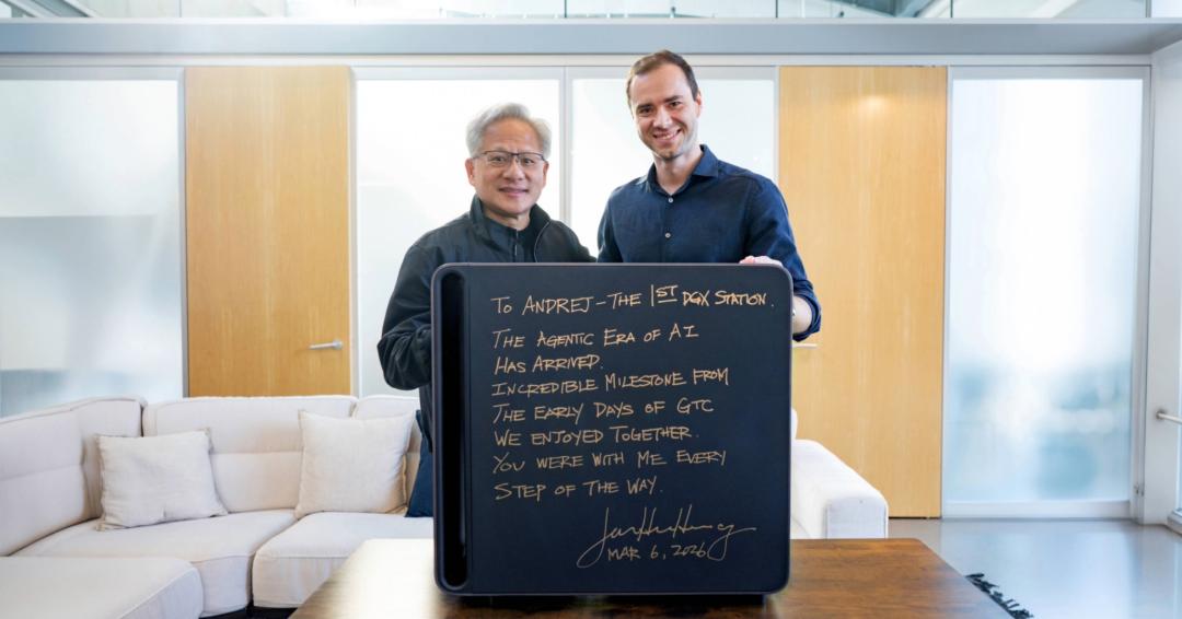 致Andrej——第一台DGX Station的拥有者:AI智能体时代已经到来,这是一个令人难以置信的里程碑时刻,也让人想起我们一起走过的GTC早期岁月。一路走来,你始终与我并肩同行。