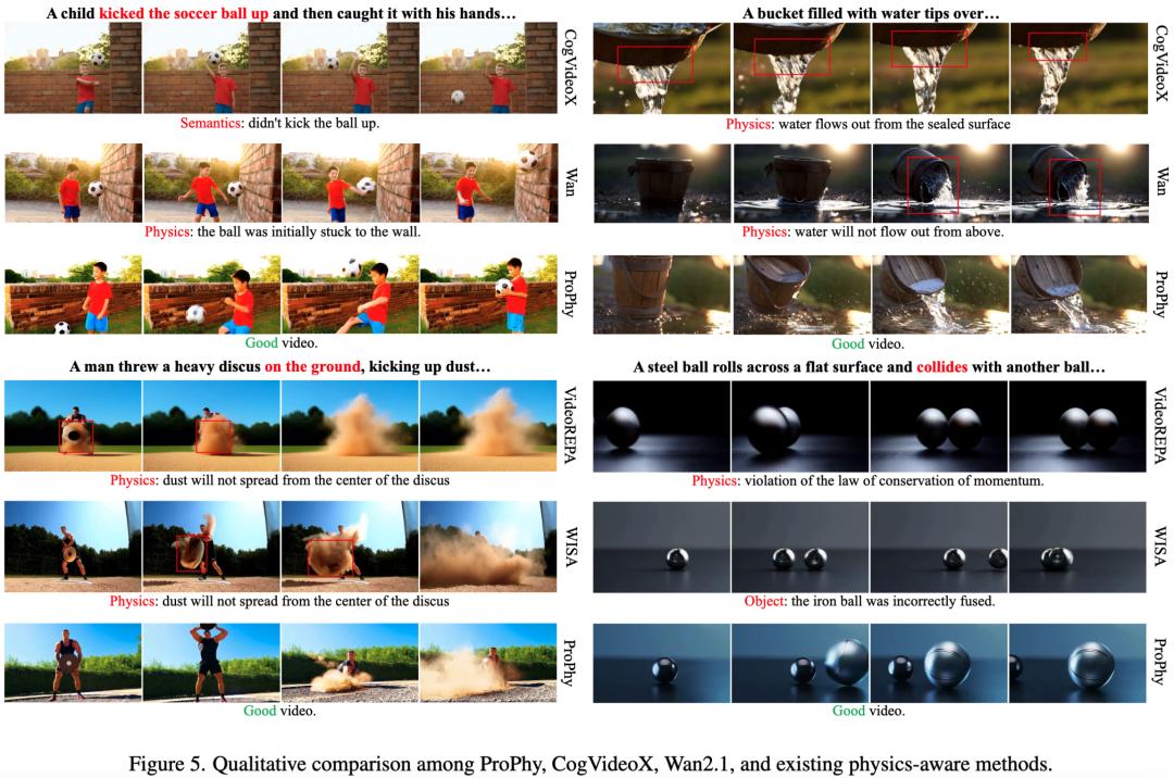 更多的定性分析也能够表明,ProPhy能够在多个物理领域下生成更加符合物理实际的视频。