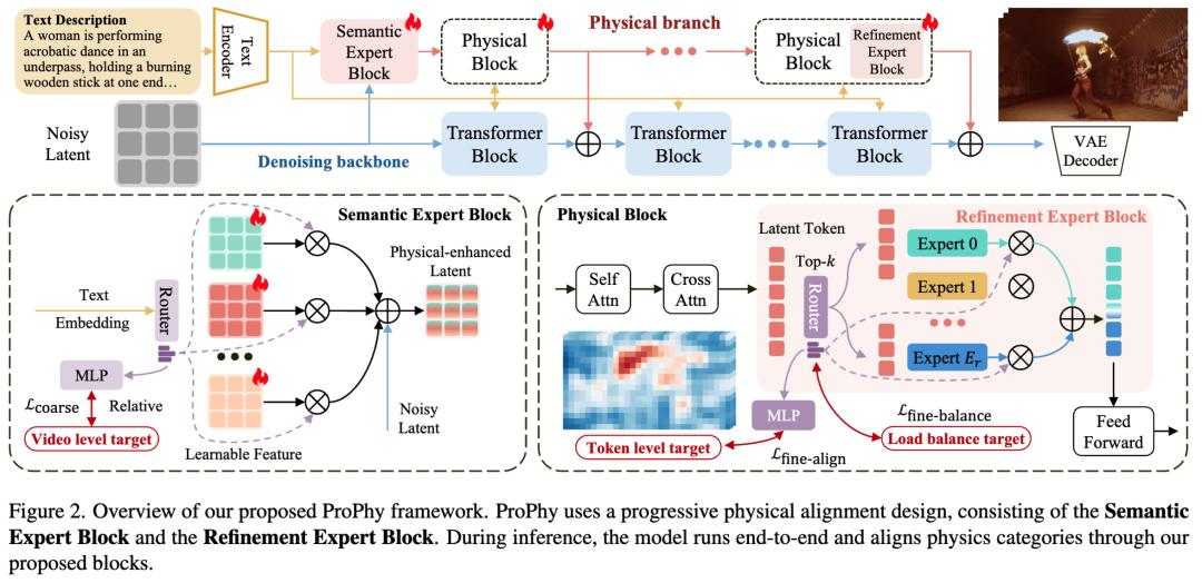 为突破这一瓶颈,中山大学和MBZUAI等机构联合提出了ProPhy。该工作构建了一种全新的渐进式物理对齐框架,使视频扩散模型首次具备“分层物理理解”与“空间物理对齐”能力——不仅能够判断应当呈现何种物理现象,更能够精准定位物理现象应发生在画面的何处。ProPhy的提出,标志着视频生成模型从“视觉逼真”迈向“物理一致”,向真正意义上的“世界模拟器”迈出了关键一步。