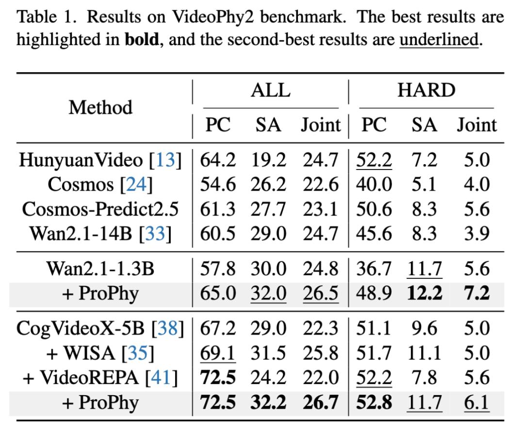 在权威物理常识评测基准VideoPhy2上,ProPhy展现出显著优势:在Wan2.1-1.3B基座模型上