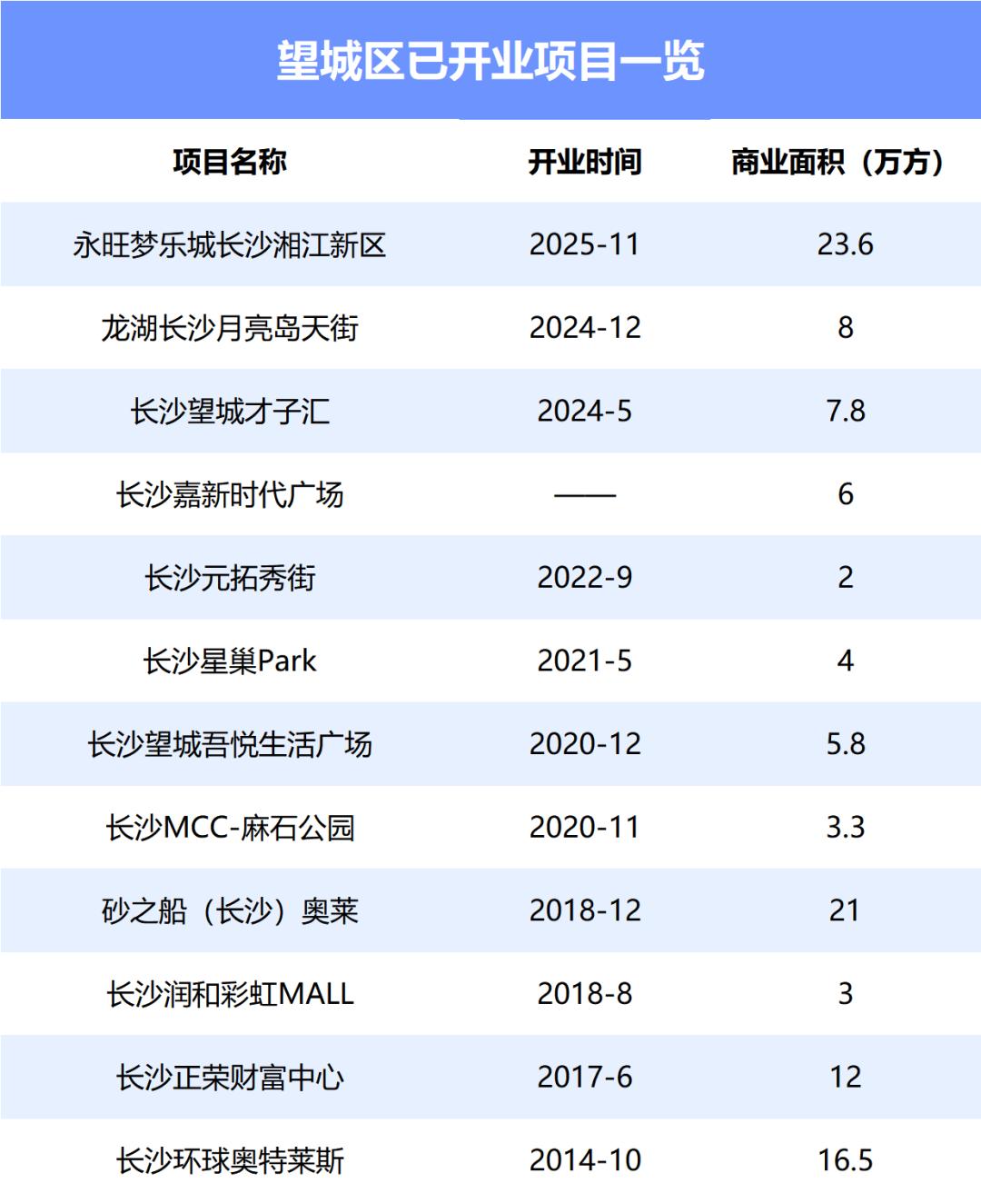 人口的聚集,直接点燃了商业的热度。据赢商网大数据显示,目前行政区内已有12个已开业商业项目,商业存量达113万方,在长沙下辖的“六区一县”中排名第六。商业版图上,不仅有长沙环球奥特莱斯、砂之船(长沙)奥莱两座奥莱项目坐镇,近两年更有长沙才子汇、龙湖长沙月亮岛天街、永旺梦乐城长沙湘江新区重量级项目接连开业,望城商业迎来高光时刻。