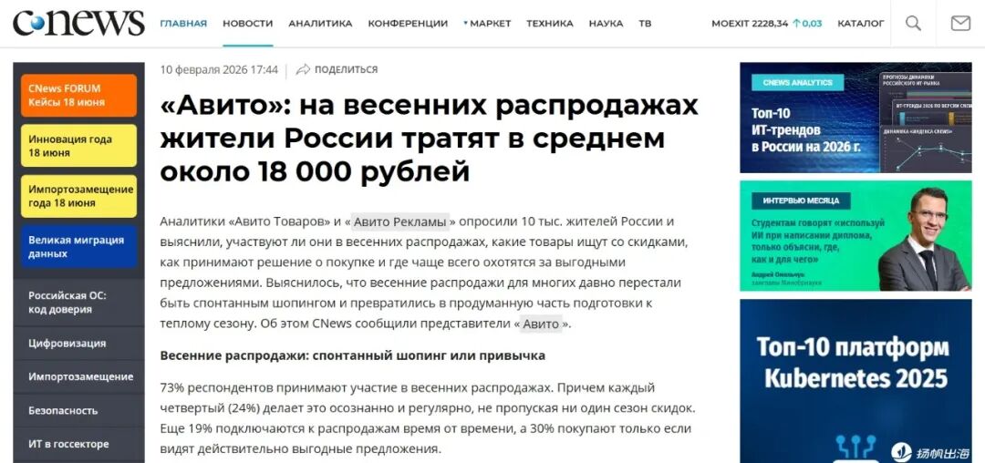 Avito:俄罗斯人在春季促销期间平均花费1.8万卢布。来源:《CNews》