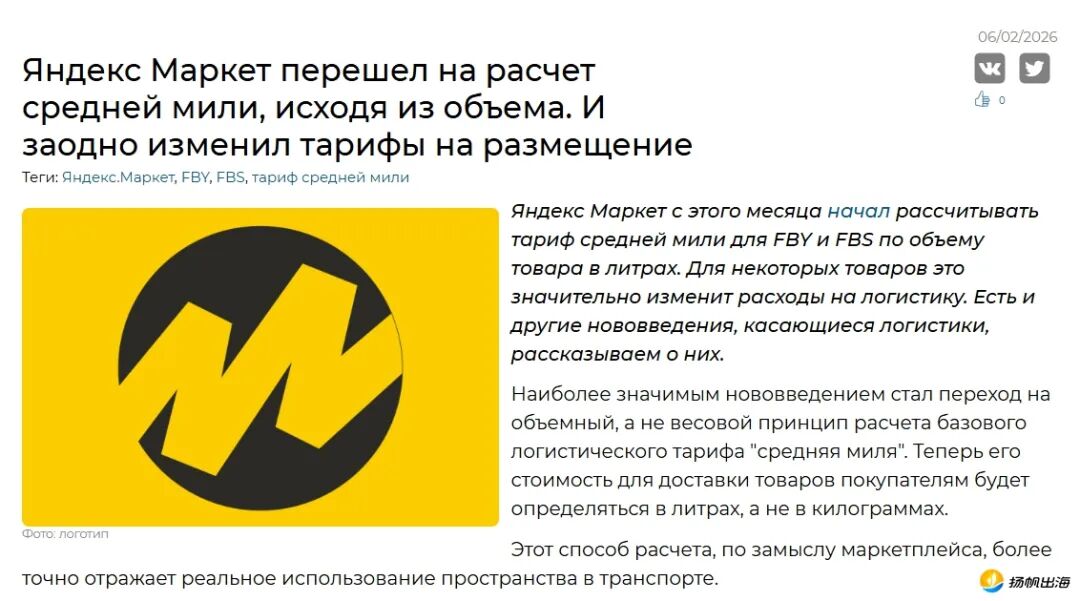 此外,Yandex Market宣布自2026年2月1日起调整物流费用计算方式,针对FBY(平台仓储配送)和 FBS(卖家自发货平台配送)服务,将平均里程(干线)费率由按重量计费改为按产品体积(升)计费。具体执行中,将依据“产品长×宽×高(单位:厘米)÷1000”的公式计算体积,结果向上取整至整数升。为确保新计费方式平稳过渡,平台仅对物流成本变动幅度较大的品类同步调整上架费用,多数常规品类上架成本保持稳定。