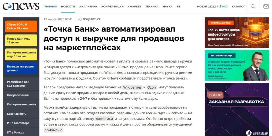 首先,支付与结算体系的自动化,正在为跨境交易注入确定性。2026年3月17日,据《CNews》报道,俄罗斯数字银行Tochka Bank已将“早回款服务”全面自动化,并向Ozon平台上的75万多名卖家开放。此前该服务仅面向Wildberries卖家且需人工处理,如今两大平台卖家均可实现24小时即时回款。支付路径的稳定与成本的下降,使跨境交易从“可行但不稳定”,转向“可持续运转”,这对于中小卖家尤为关键。