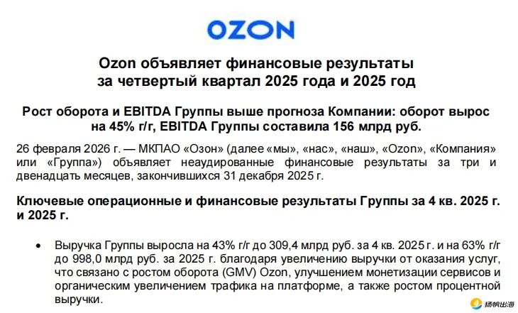 2025年第四季度及2025年关键运营与财务业绩。图源:Ozon2025年第四季度及全年财务业绩公告