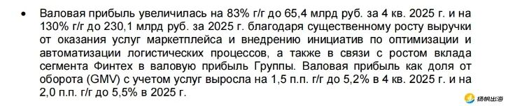 2025年第四季度,集团毛利率同比飙升83%至654亿卢布,全年毛利率更是暴涨130%达到2301亿卢布。图源:Ozon2025年第四季度及全年财务业绩公告