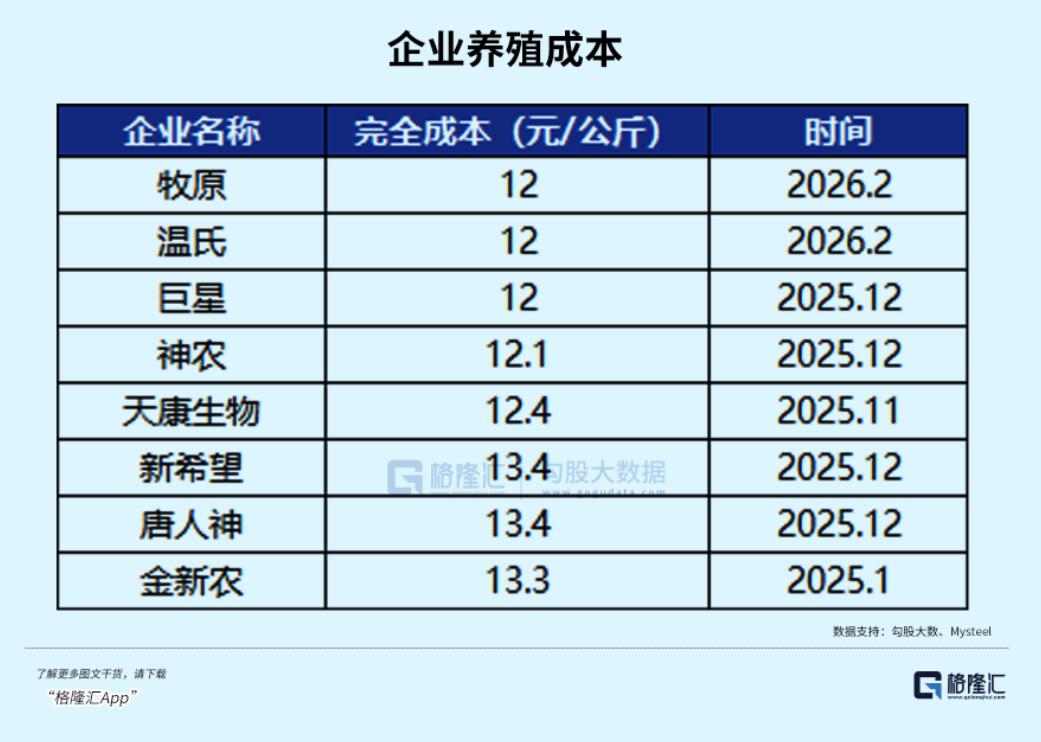 目前,行业内中小型养殖企业的成本普遍在13元/公斤左右,哪怕是主打“自繁自养”的头部猪企,养殖成本也在12元/公斤左右。