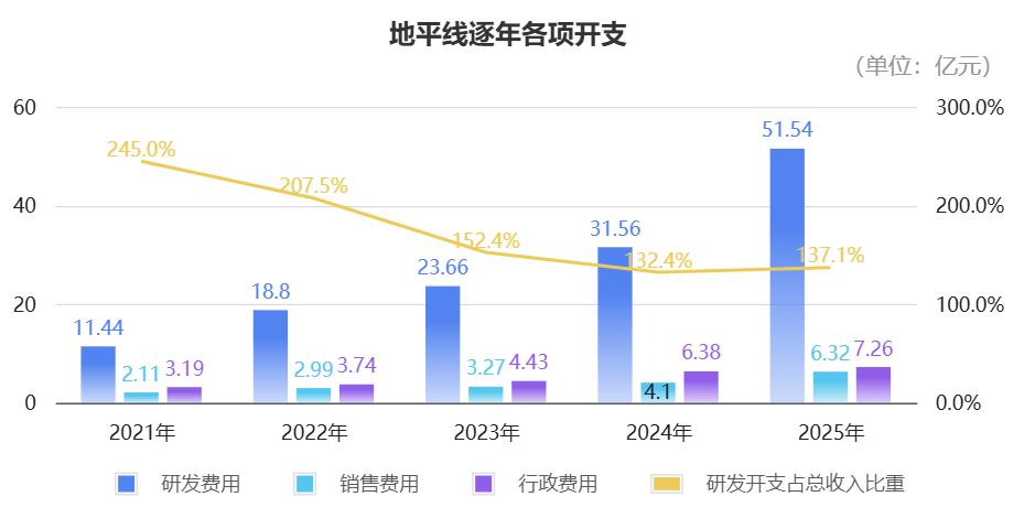2025年,地平线的研发开支为51.54亿元,同比增长63.3%,是同期收入的1.37倍。