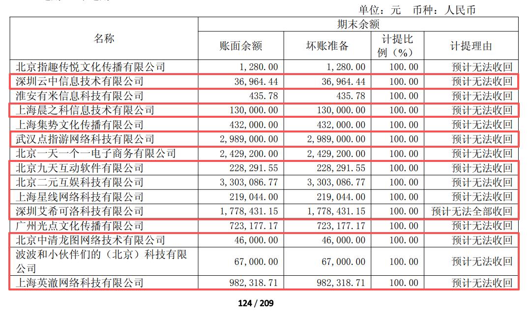 今日(3月20日),上市公司国旅联合在它的2025年财报中披露了26家拖欠款项并要做坏账准备的客户,其中有10家是游戏公司——中清龙图、晨之科、二元互娱、星线网络、英澈网络、波波和小伙伴们、艾希可洛、九天互动、云中信息以及武汉点指游,坏账金额在3万元-330万元之间。
