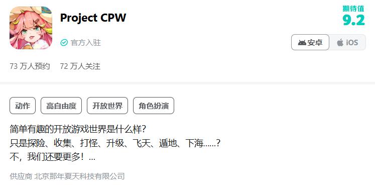 九天互动(那年夏天)旗下曾经释出过一款早期项目《Project CPW》的首曝PV,一经推出就获得了不错的关注,截至发稿时间,游戏共在TapTap收获了73万人预约,期待值则有9.2。