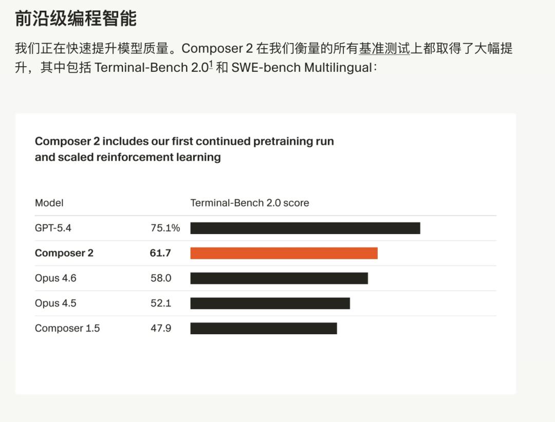 在一项关键的编程基准测试(Terminal-Bench 2.0)上,Composer 2 竟然 反超了 Claude 的旗舰模型 Opus 4.6。