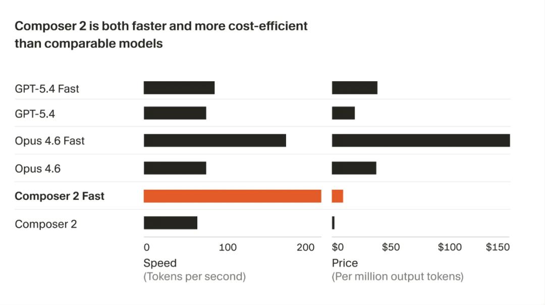 当下, AI 竞争已经卷到了“谁能用更少的钱吐出更多 token”这步,而 Composer 2.0 在速度和成本这两端,竟然同时碾压了 Opus 4.6、GPT-5.4 这两个老对手。Cursor 也是毫不客气地放一张图,把三者的数据对比直接摆上台面。