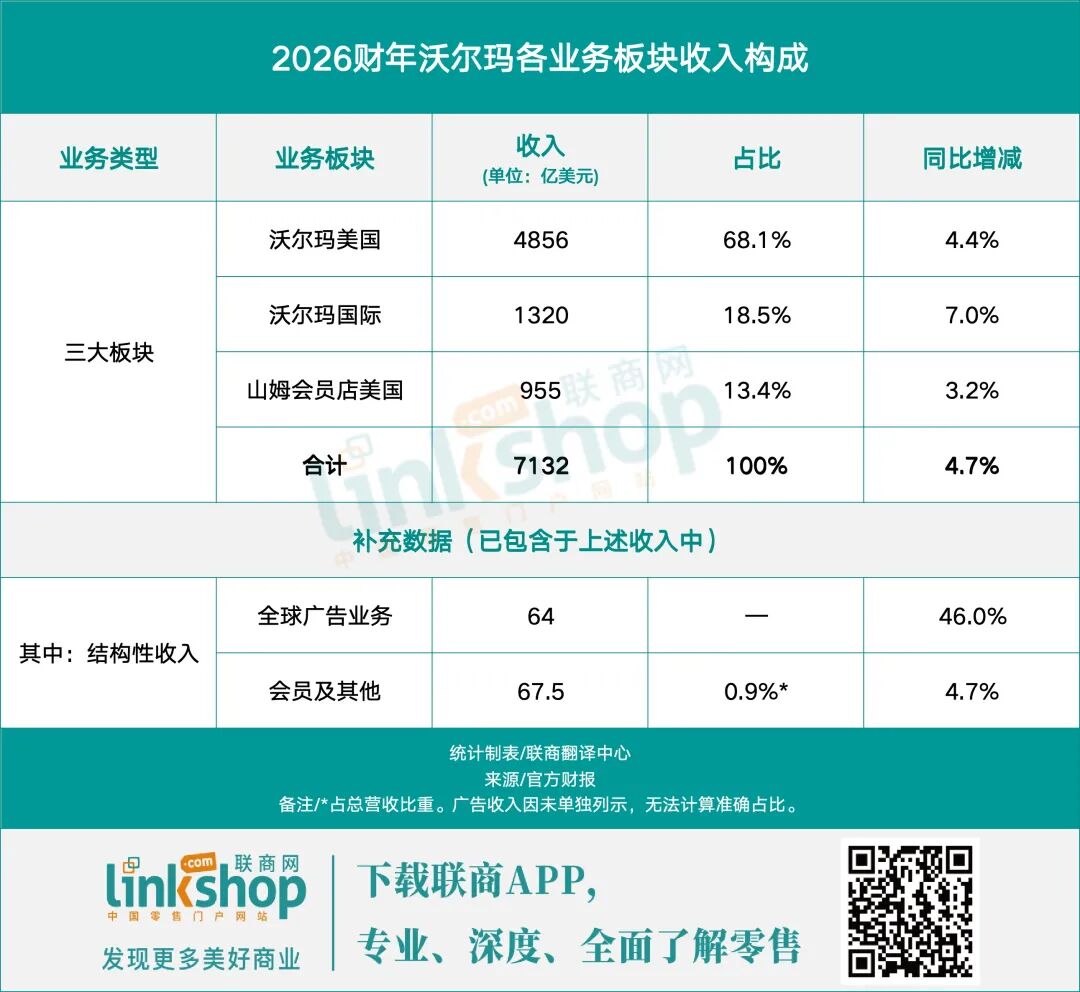 数据显示,沃尔玛最新财年营收达7132亿美元(约4.91万亿元人民币),同比增长4.7%。其中,公司总净销售额7064亿美元(约4.86万亿元人民币),占比超过99%。按业务板块划分,沃尔玛美国业务依然稳居主体,占比68.1%;国际业务则以更快的增速持续扩张,占比18.5%;山姆美国业务占比13.4%。