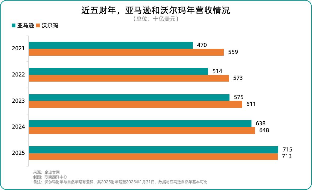 2018年至2025年间,亚马逊的复合年均增长率约为沃尔玛的三倍。大约一年前,亚马逊单季度营收便首次超越沃尔玛。但对这家电商巨头而言,能够追赶上拥有32年先发优势的对手,绝非依靠“电商”这一成不变的打法所能实现。