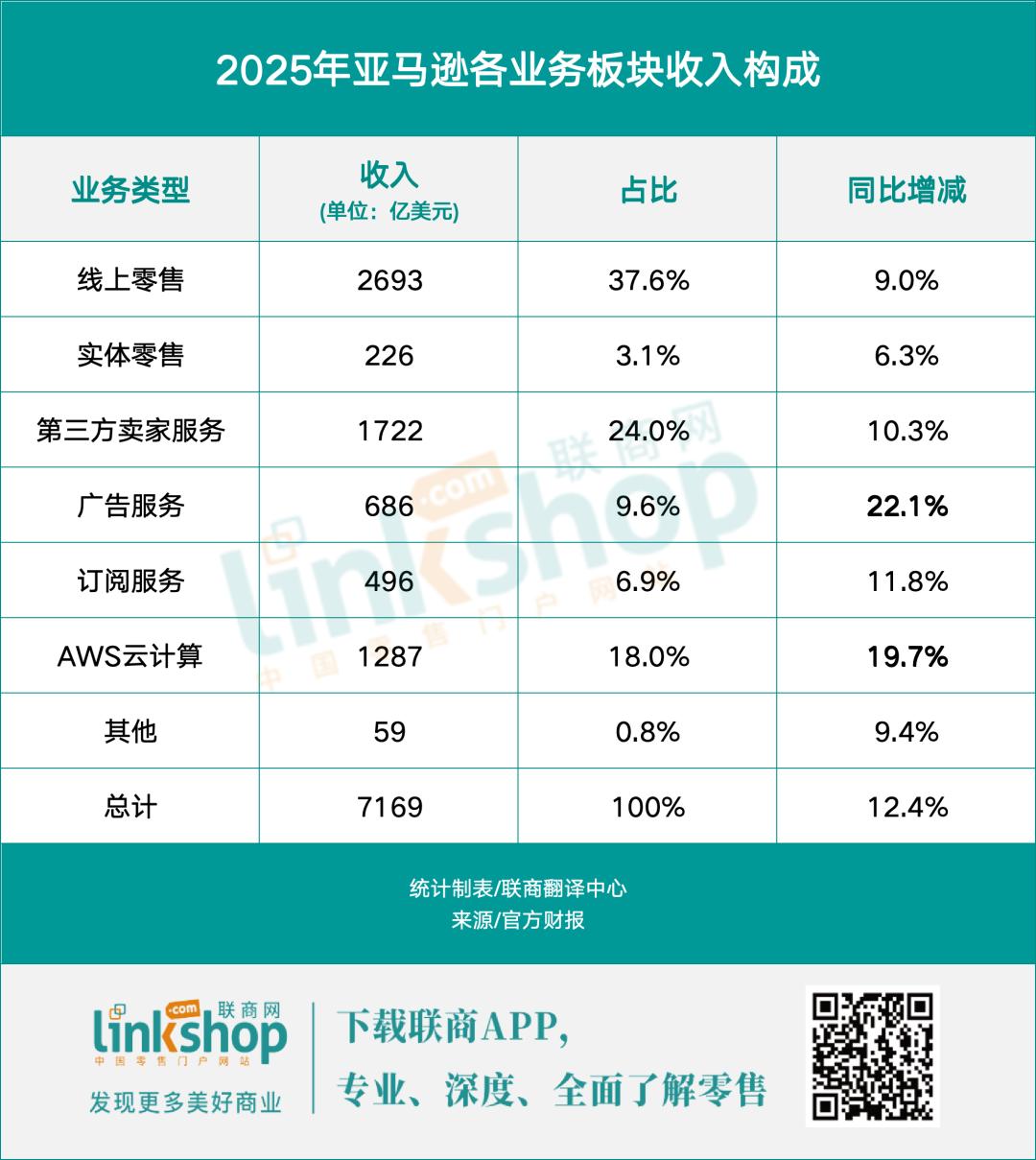 根据亚马逊2025财年年报,自营线上零售以37.6%的收入占比继续位居第一,但第三方卖家服务与AWS合计已接近四成,再加上广告业务,平台服务与云计算的合计占比实际上已经超过自营电商。此外,自营线上零售的增速为9.0%,不及广告业务和AWS的一半。