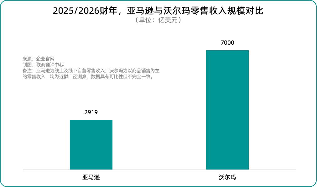如果从以“卖货”为核心的零售维度看,亚马逊线上、线下零售板块合计营收2919亿美元(约2.01万亿元人民币);而沃尔玛以商品销售为主的零售收入规模接近7000亿美元(约4.82万亿元人民币)。相比之下,沃尔玛的领先优势依然十分明显。
