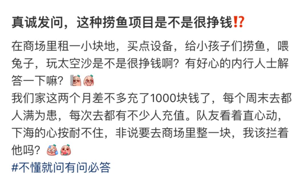 同理,不论10块钱买包胡萝卜喂兔子,还是39块钱玩一个小时太空沙,都是绝对吸引小孩的暴利游乐项目。