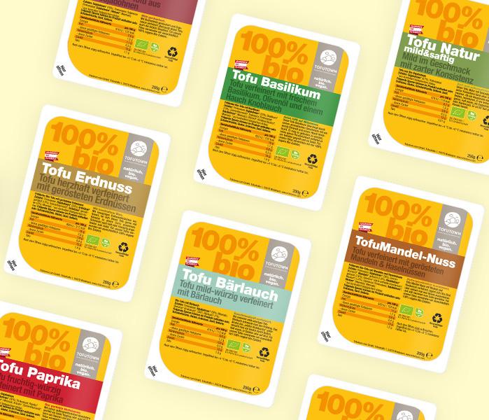Tofutown旗下100%有机豆腐产品系列,涵盖多种风味:原味(Natur)、罗勒(Basilikum)、花生(Erdnuss)、熊葱(Bärlauch)、杏仁榛子(Mandel-Nuss)、甜椒(Paprika)等