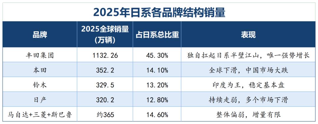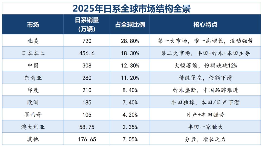 梳理完日系车的全球销量版图,答案已然清晰。日系车的全球基本盘,仅剩北美、日本本土、印度三块相对稳固的市场,而中国市场大幅失血、东南亚后花园被攻破、新兴市场全面失守、欧洲与俄罗斯市场持续萎缩,此消彼长之下,2025年被中国汽车反超,从来不是意外。