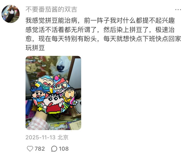 周末跟闺蜜急赤白脸地来到城中村那家自建房的四楼,再酣畅淋漓地玩一场拼豆,回去更珍惜格子间里的牛马生活了。