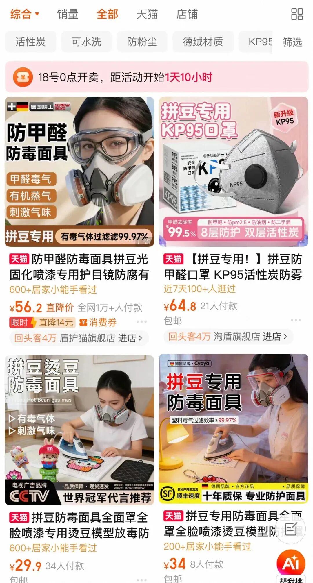 基于以上对身体造成的威胁,有人发现了拼豆的支线商机,灵机一动给防毒面具加了个“拼豆专用”的关键词,迎着风口含泪多赚了几块钱。