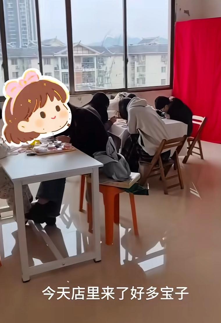 有人用AI帮老板生成了一张她心目中店里的热闹场景,大人小孩挤满了这间简陋的小屋,谁看了不说一句“拼豆窝点”。