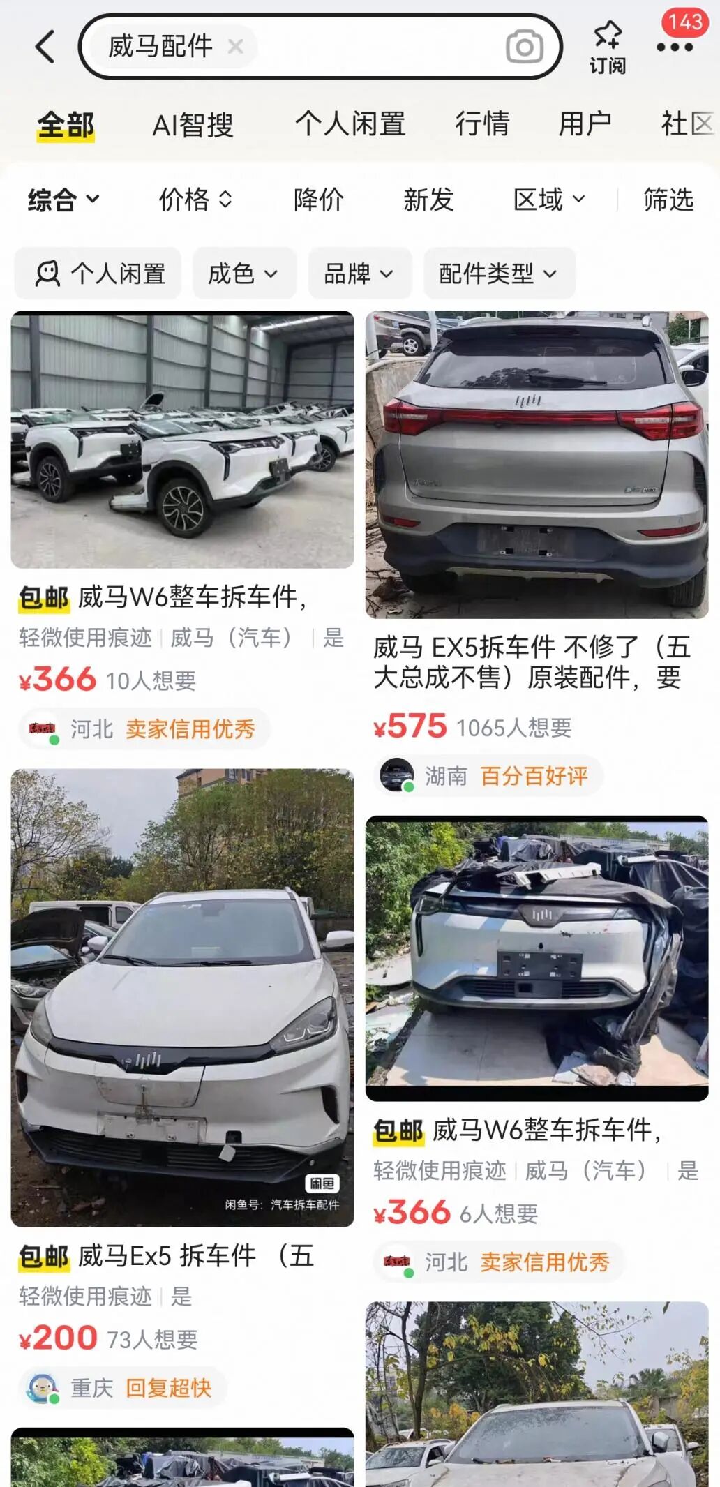 真正麻烦的是配件,许多威马车主表示:连保险杠都要等几个月,即便闲置平台可以淘到拆车件,质量也是参差不齐,回来还要重新喷漆,找维修店安装,增加了使用成本。