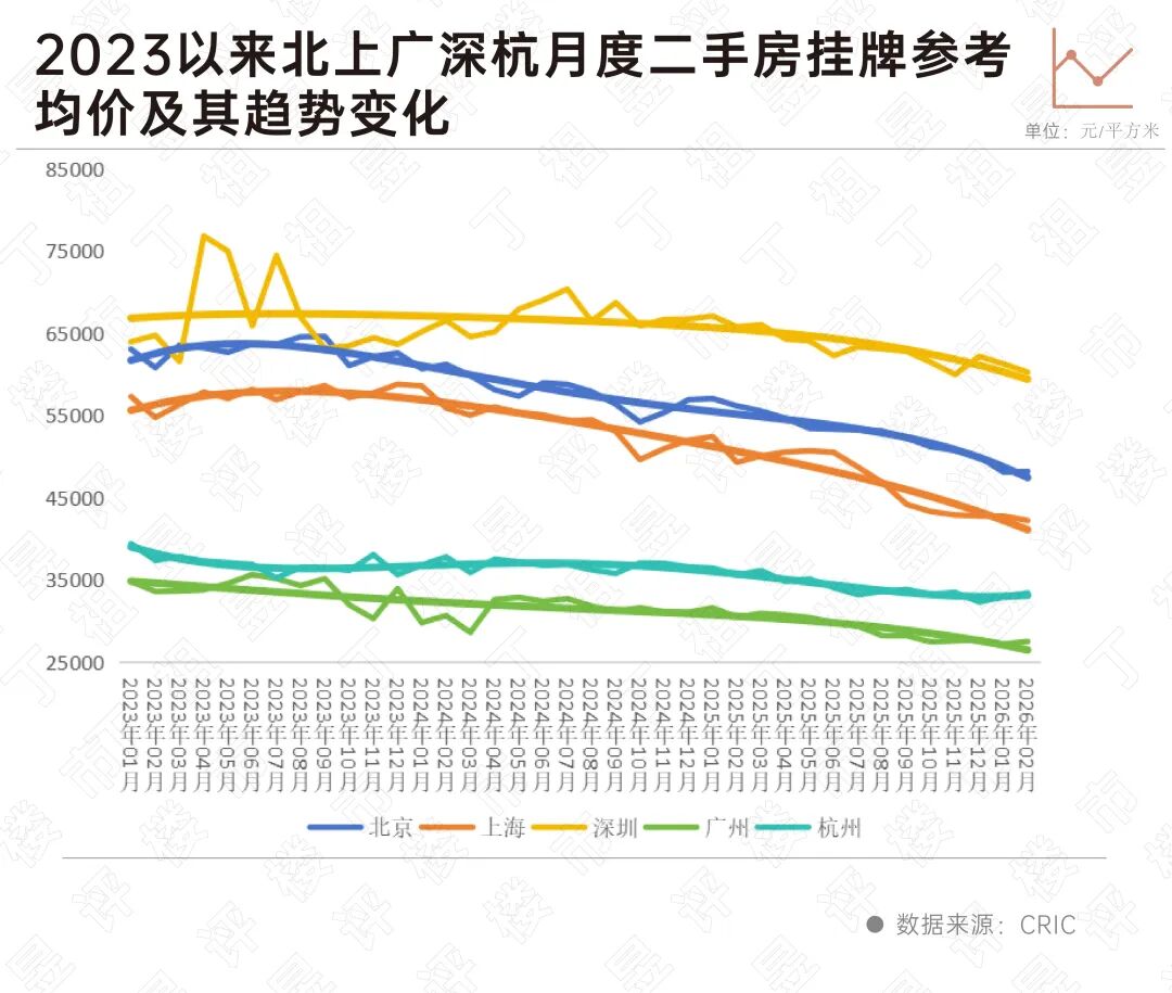 从数据来看,上海2026年2月二手房挂牌参考价为42258元/平方米,环比降1.24%,同比降14%。同样,北京2月份的二手房挂牌参考价为48224元/平方米,环比出现止跌,但同比仍降14.18%。仅广州和杭州挂牌参考价环比有所上升。