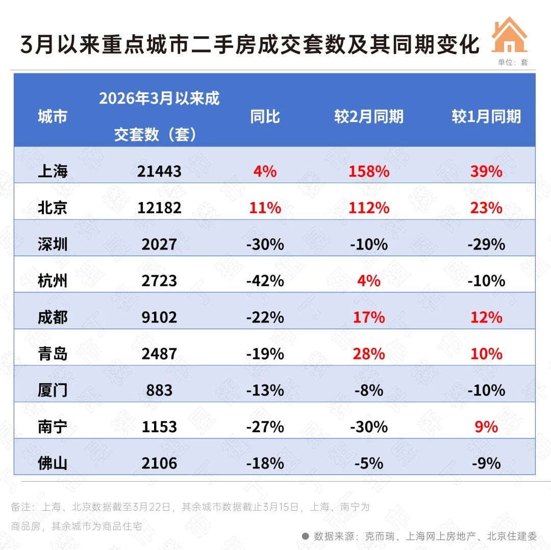 尤其是上海。3月以来的三个周末二手房单日成交均破千套,截至3月22日累计成交已破2万套,预计二手房成交套数将破3万套。