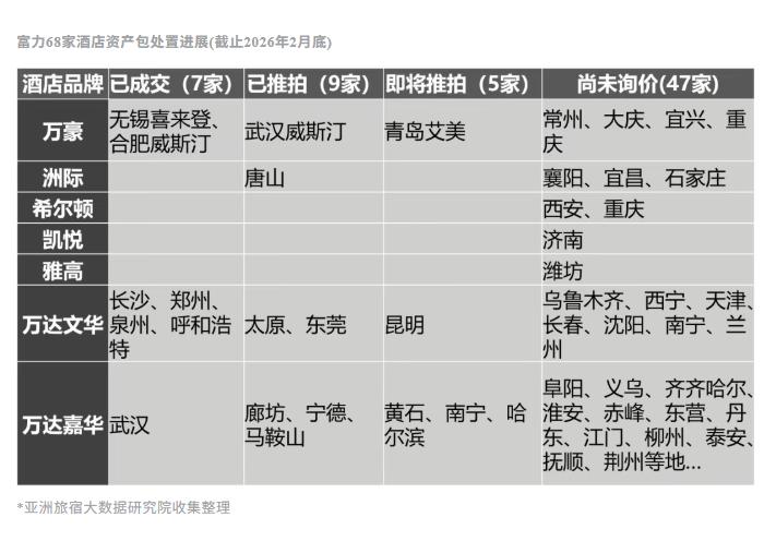 2025下半年开始,银行启动了对68家酒店的司法处置,目前已有16家酒店被上架拍卖,其中长沙文华、郑州文华、泉州文华、武汉嘉华、无锡喜来登、合肥威斯汀等7家酒店已经成交,廊坊嘉华、宁德嘉华仍在变卖阶段流拍,预计将在降价后迎来新一轮拍卖。