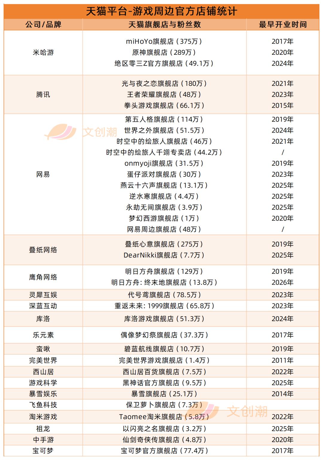 文创潮统计发现,目前头部游戏几乎全部涉猎游戏周边,许多都已在电商平台开设旗舰店,尤其是在2024年谷子火爆出圈之后,各家厂商更是加速布局。
