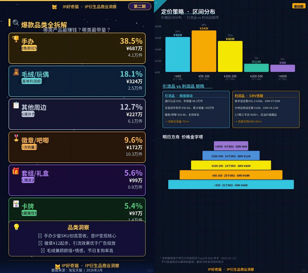 明日方舟旗舰店的Top100 SKU在2025年共创造了大约1.6亿的GMV,其中50-200元区间的43个SKU贡献了近60%的GMV。