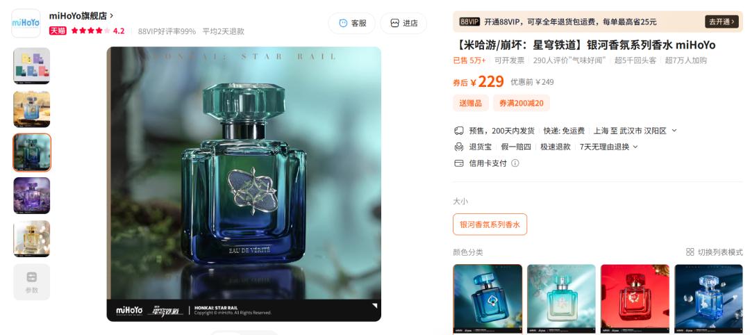 米哈游miHoYo旗舰店的2025年度爆款,香水系列意外进入Top5,“银河香氛系列香水”单款斩获1286万元GMV;叠纸早在2022年就上线《恋与制作人》角色专属香水,之后又陆续上新了不少香水、护手霜等美妆个护产品;深蓝互动的《重返未来:1999》同样推出了角色香水。