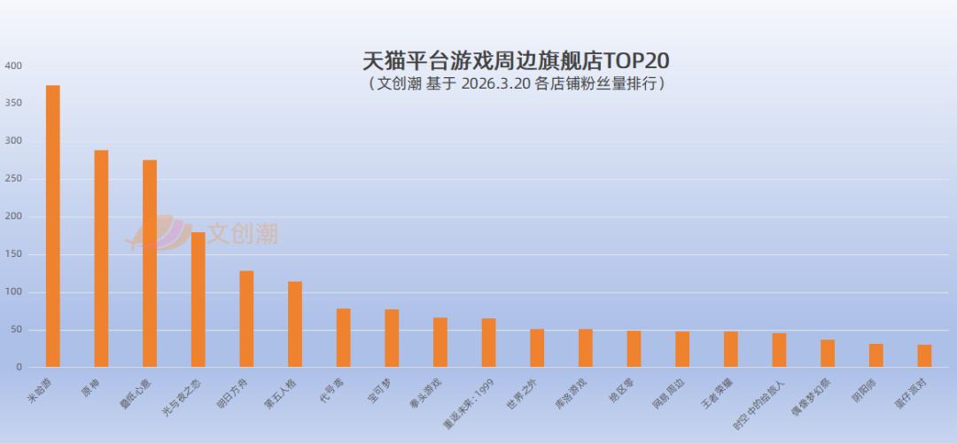 比如,在天猫平台已有6家游戏周边店铺粉丝超百万(米哈游、原神、叠纸心意、光与夜之恋、明日方舟、第五人格),12家店铺粉丝超50万(后六家分别是代号鸢、宝可梦、拳头游戏、重返未来:1999、世界之外、库洛游戏)。