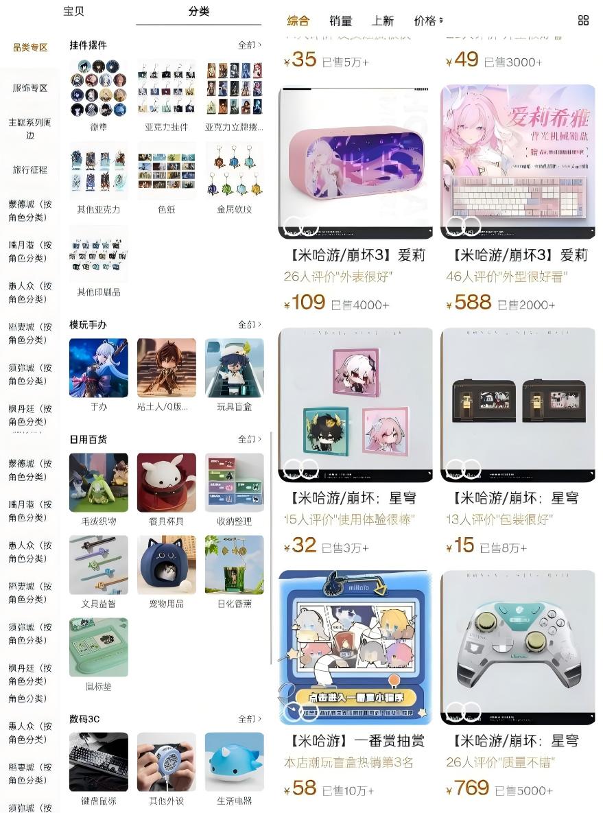 米哈游miHoYo旗舰店中,崩坏:星穹铁道和崩坏3均推出机械键盘、游戏手柄、磁吸散热器、蓝牙耳机、快充头等产品。在米哈游的爆款产品中,遐蝶精英手柄(842元)和流萤手柄(843元)两个SKU合计创收2063万元,比很多手办能打。米哈游绝区零和库洛游戏旗舰店,同样推出机械键盘、游戏手柄、耳机、充电宝等3C数码产品。