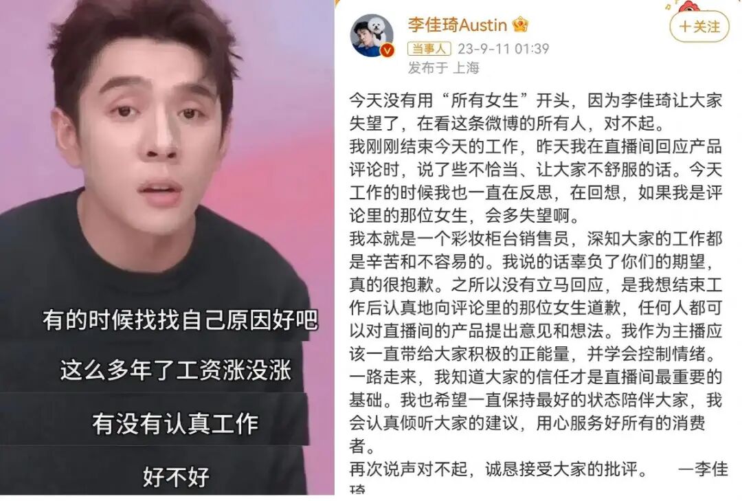 李佳琦直播截图和道歉微博 来源:网络